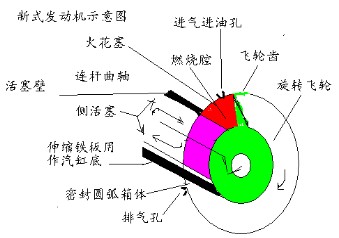 如圖所示:做功之初,提起活塞,首先將伸縮鐵板插進(jìn)密封圓弧箱體內(nèi)用作汽缸底,飛輪齒用作汽缸頂,進(jìn)油進(jìn)氣后,推進(jìn)活塞,壓迫油氣做功,飛輪旋轉(zhuǎn)帶動車體運(yùn)動。最后排出廢氣復(fù)位,重復(fù)做功。